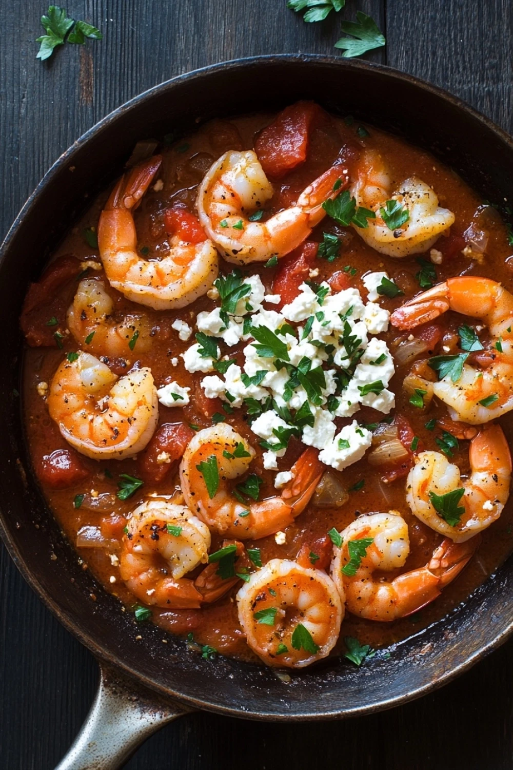A quick and flavorful one-pan dish featuring succulent shrimp cooked in a rich tomato sauce with creamy feta cheese and fresh herbs. Perfect for a weeknight dinner!
