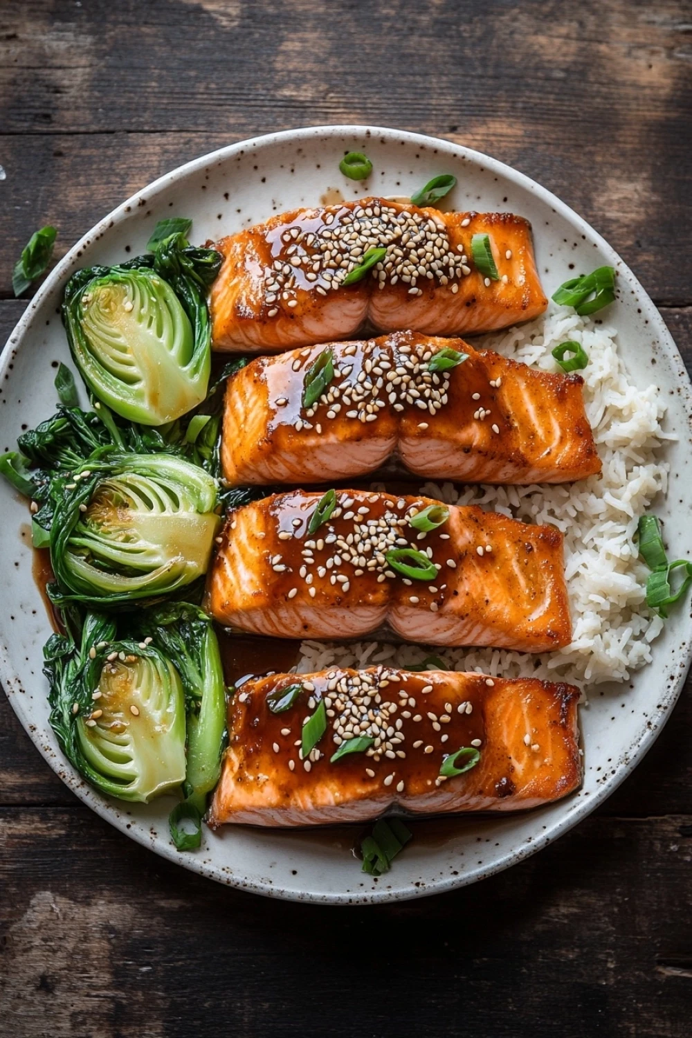A flavorful and easy Asian-inspired salmon dinner featuring a savory soy-ginger glaze, served with steamed jasmine rice and sautéed bok choy.