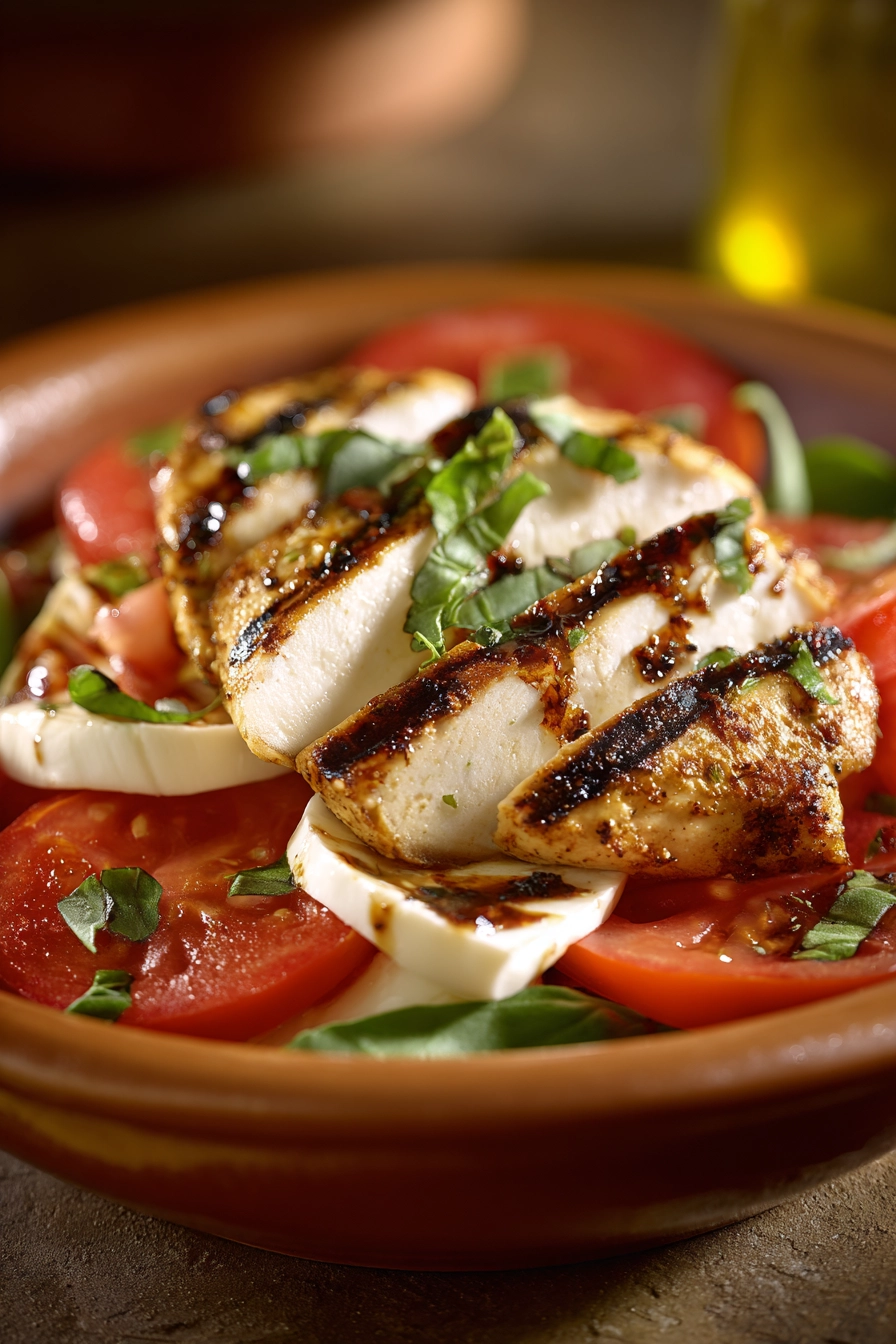 A fresh and flavorful Grilled Chicken Caprese Salad featuring juicy grilled chicken breasts, ripe tomatoes, creamy mozzarella, and fragrant basil, drizzled with a balsamic glaze for a perfect light meal.