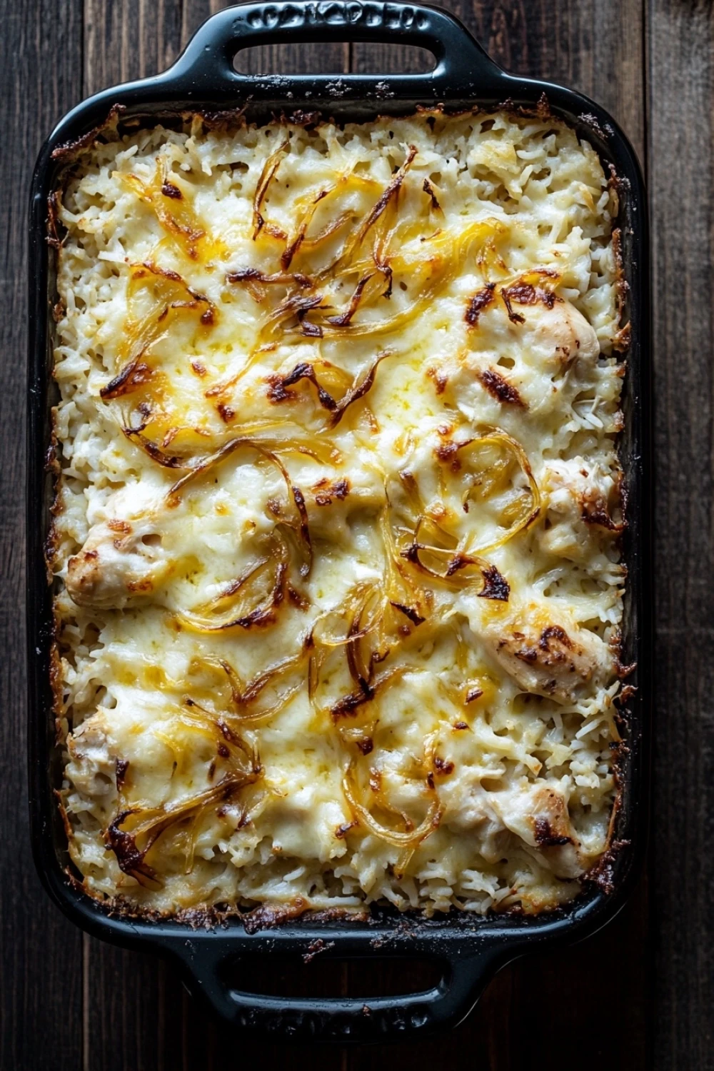 A comforting and flavorful chicken rice casserole inspired by the rich taste of French onion soup, topped with melted cheese and caramelized onions for a deliciously hearty meal.