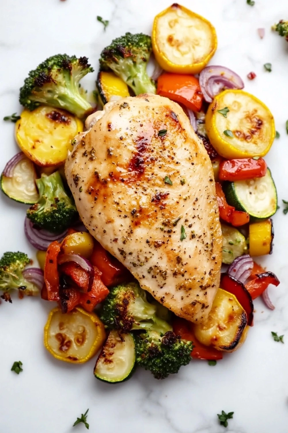 Serve each chicken breast with a generous portion of the roasted vegetables.